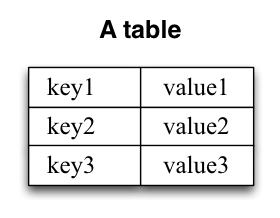 A simple form of a table is a collection of key-value pairs, also called a map or associative array. Such a table may look as follows: