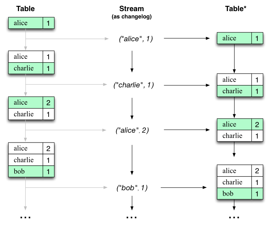 - Stream as Table : A stream can be considered a changelog of a table, where each data record in the stream captures a state change of the table. A stream is thus a table in disguise, and it can be easily turned into a “real” table by replaying the changelog from beginning to end to reconstruct the table. Similarly, in a more general analogy, aggregating data records in a stream - such as computing the total number of pageviews by user from a stream of pageview events - will return a table (here with the key and the value being the user and its corresponding pageview count, respectively).