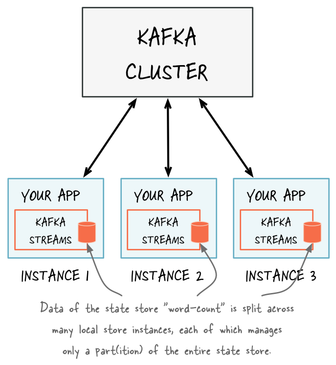 The full state of your application is typically split across many distributed instances of your application, and across many state stores that are managed locally by these application instances.